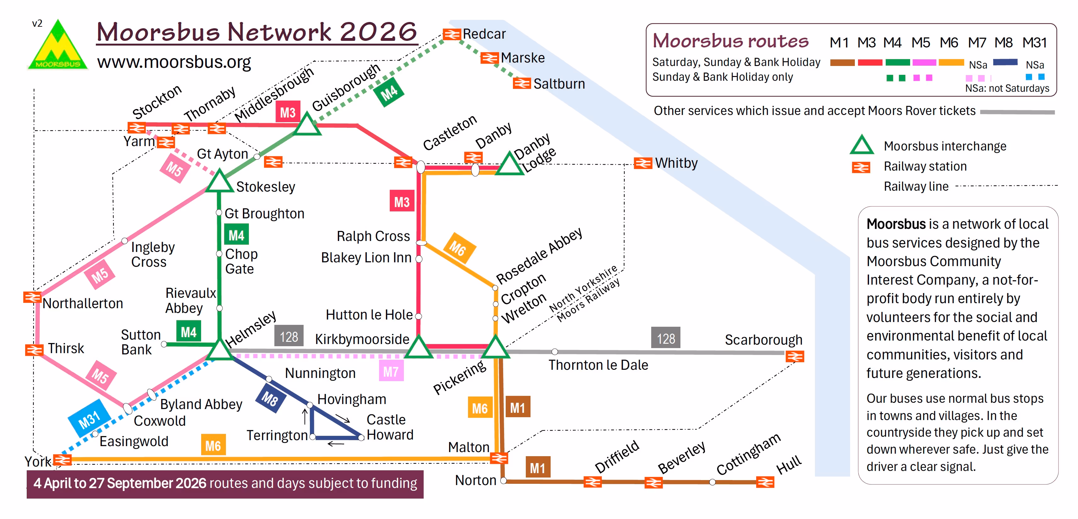 Welcome to the draft Moorsbus Network map for 2026. It shows the routes we hope to operate between April and the end of September, along with an indication of which services are likely to run on a Saturday, Sunday, Bank Holiday or all those days. This is subject to the Community Interest Company raising sufficient funds and confirming operators, drivers and buses to provide our much-cherished services for the North York Moors. We know you want the confirmed route and timetable details, and so do we! We will update this information as soon as we can.